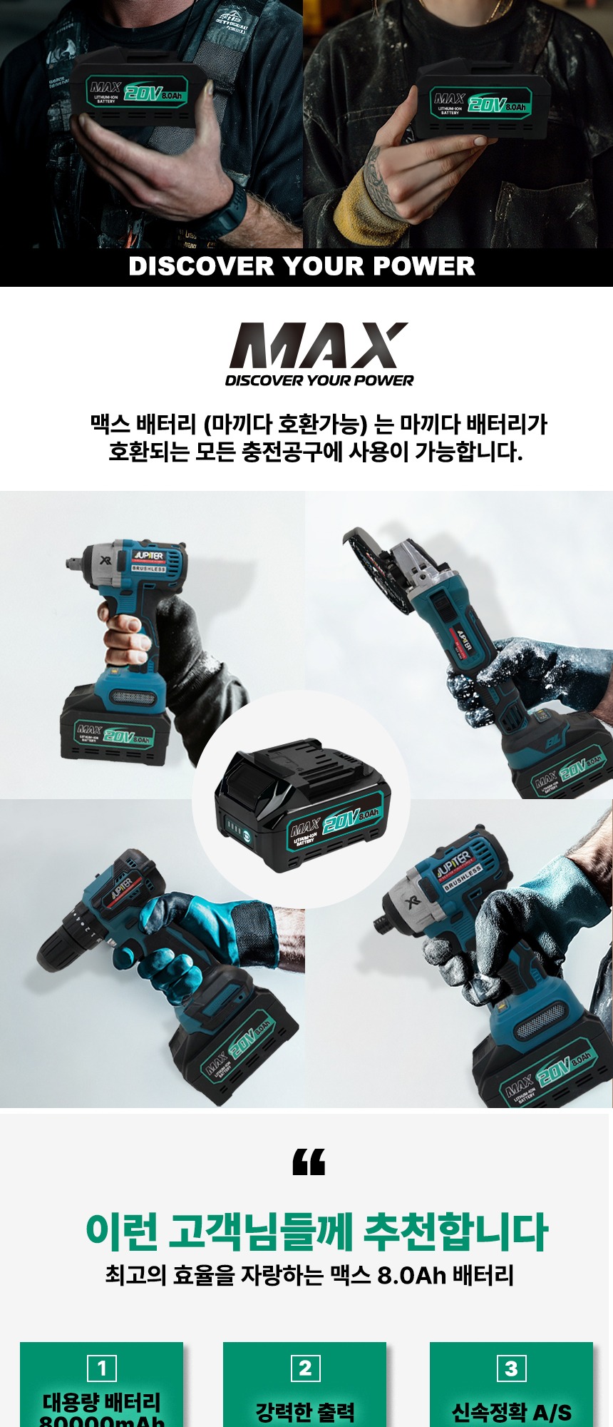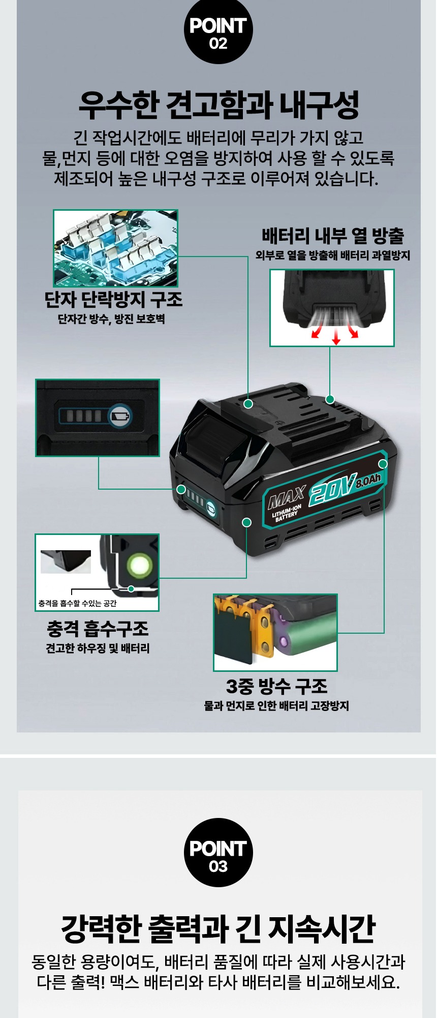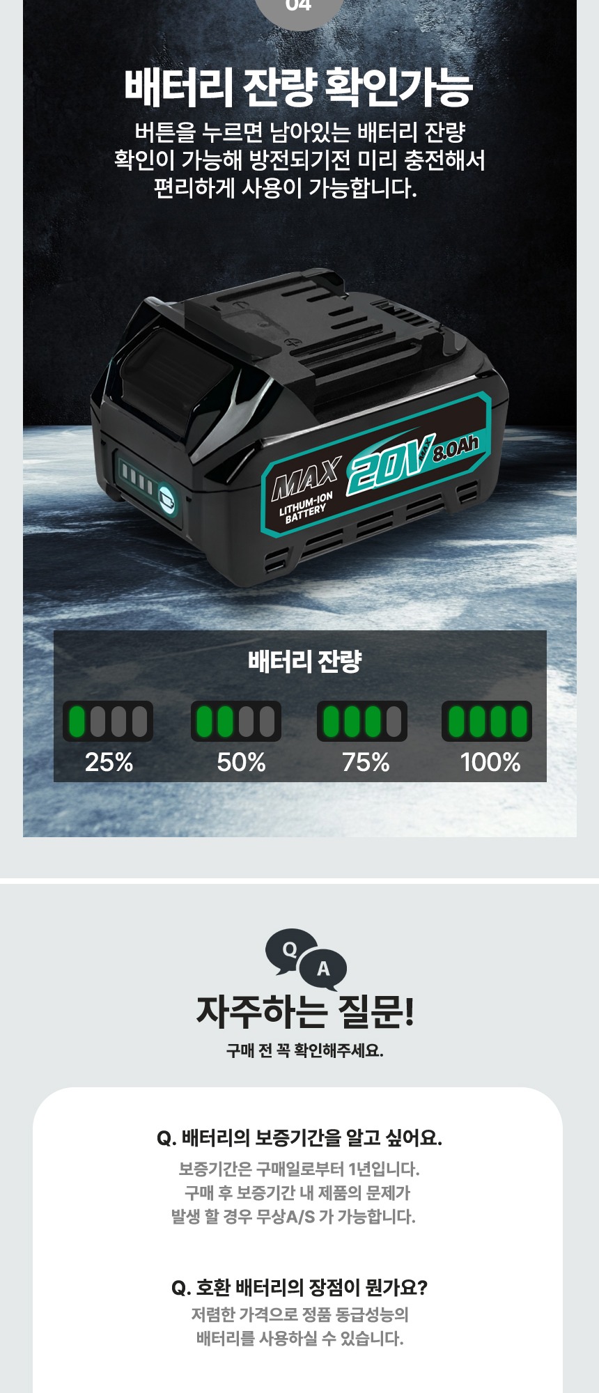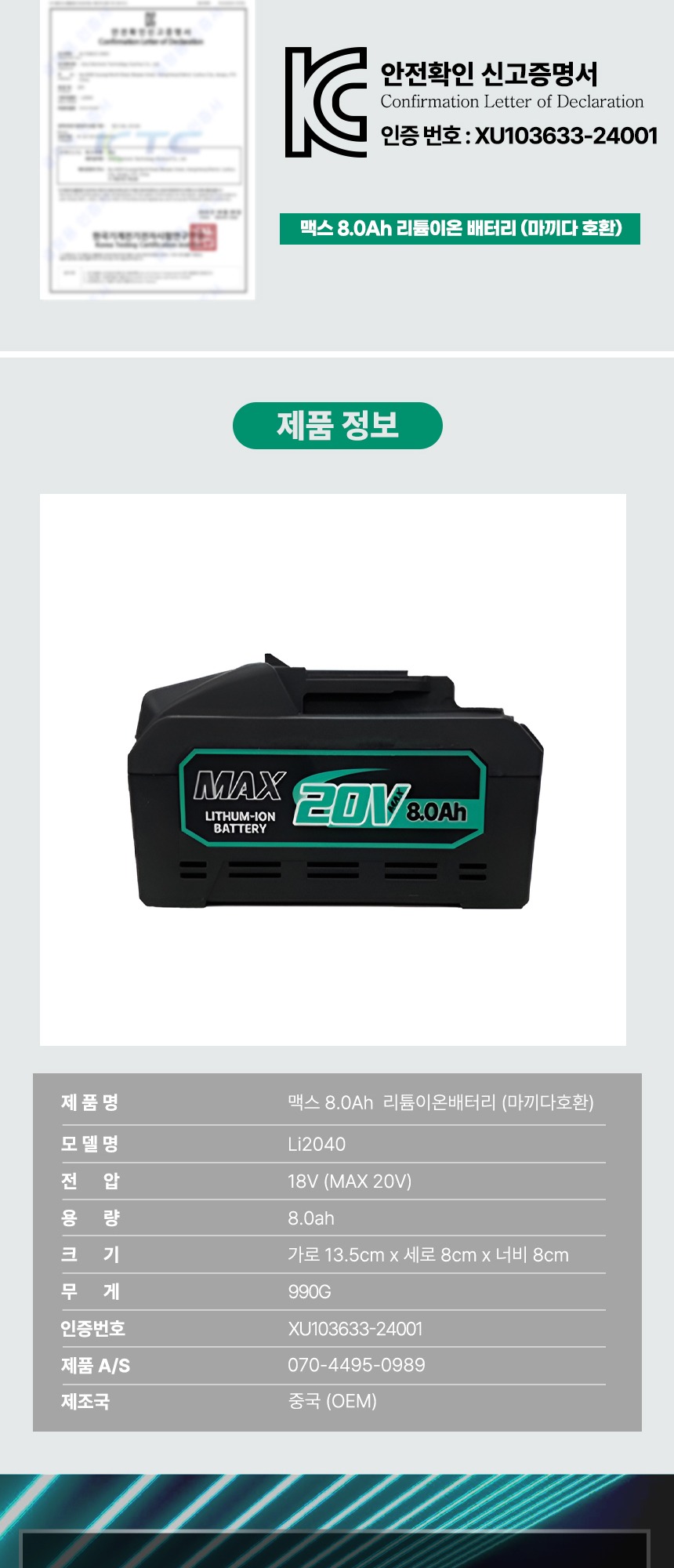 전압 : 18V (20V MAX) 용량 : 8.0Ah 크기 : 13.5 x 8 x 8 cm 무게 : 990g