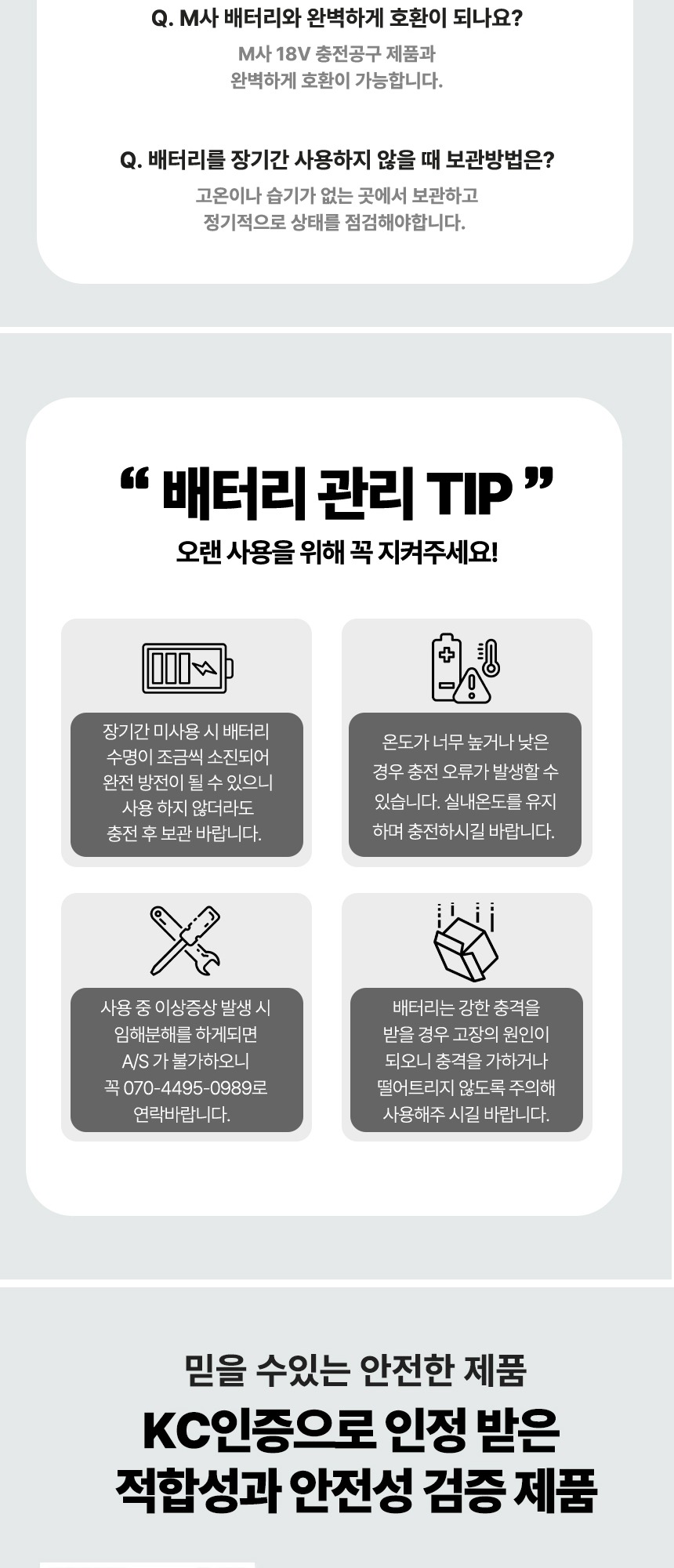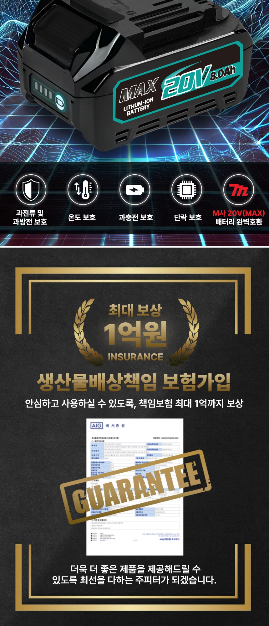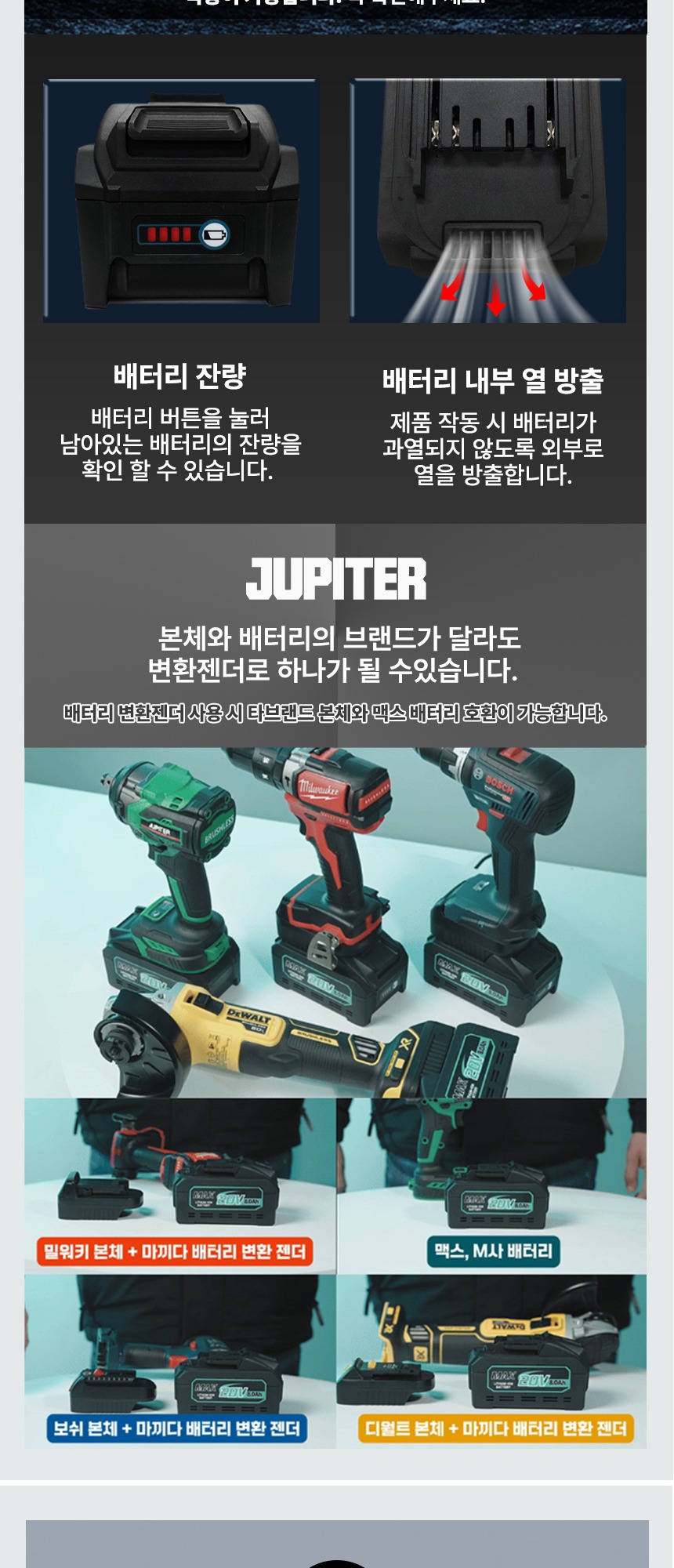 전압 : 18V (20V MAX) 용량 : 8.0Ah 크기 : 13.5 x 8 x 8 cm 무게 : 990g
