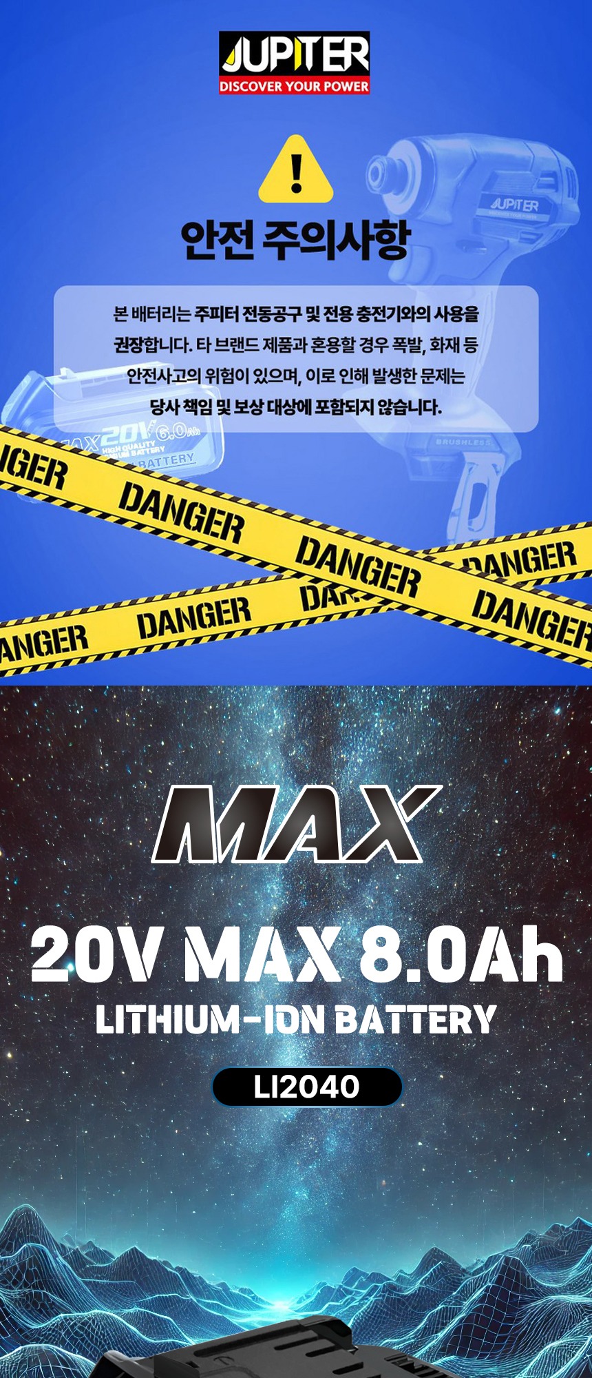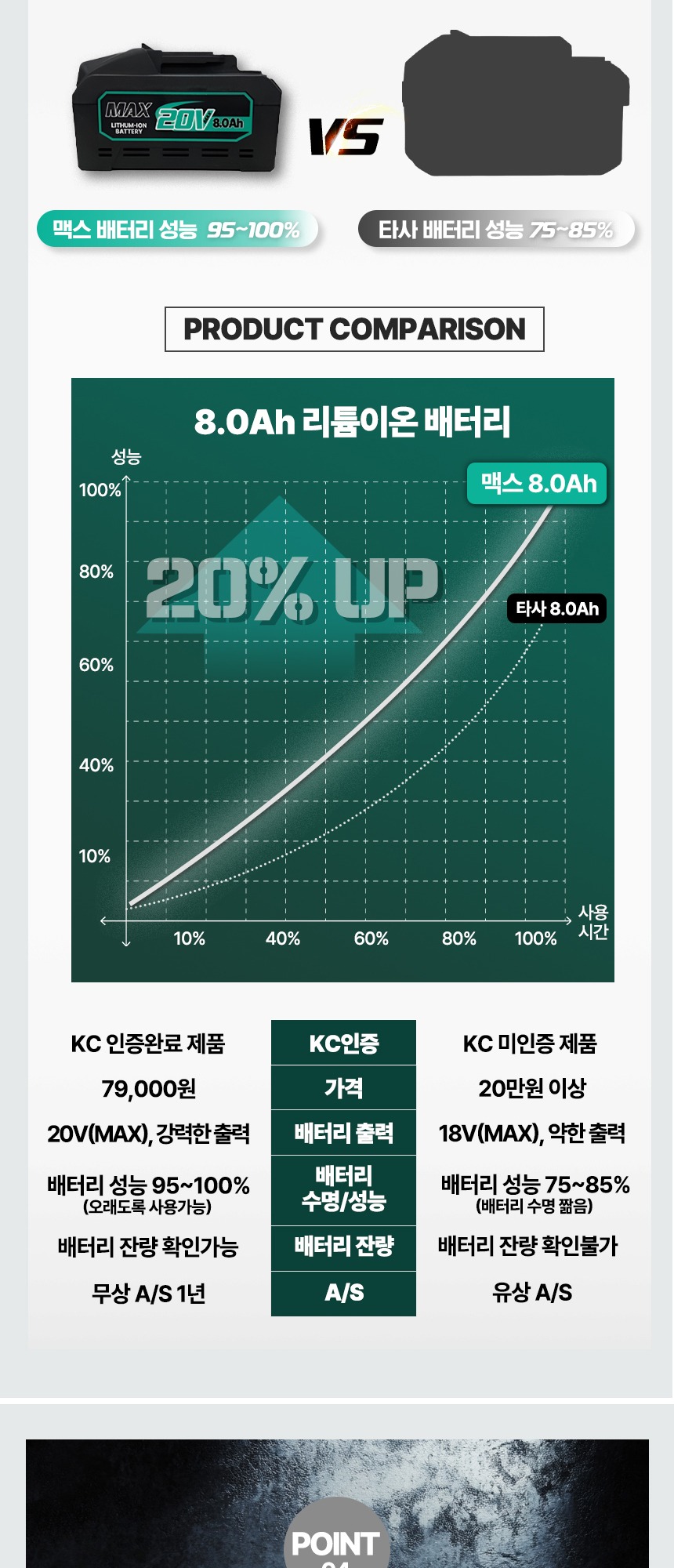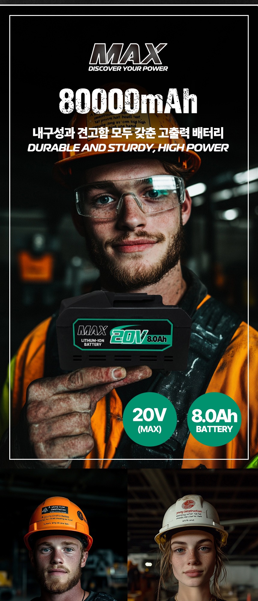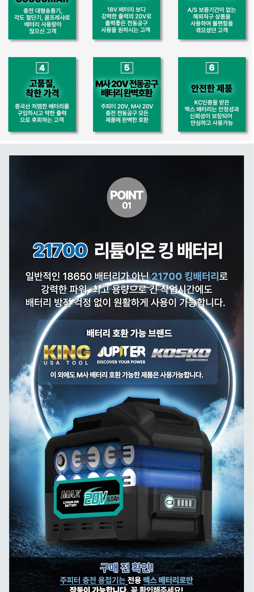 전압 : 18V (20V MAX) 용량 : 8.0Ah 크기 : 13.5 x 8 x 8 cm 무게 : 990g