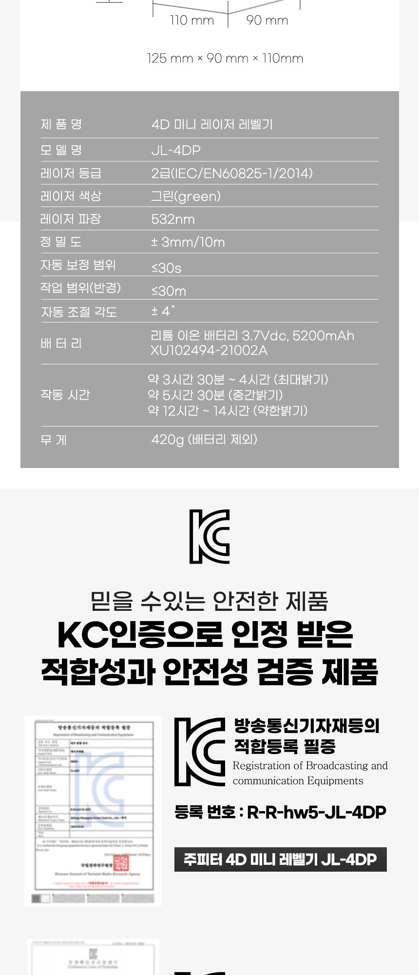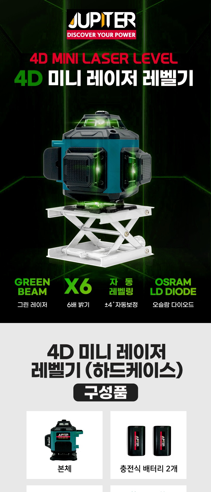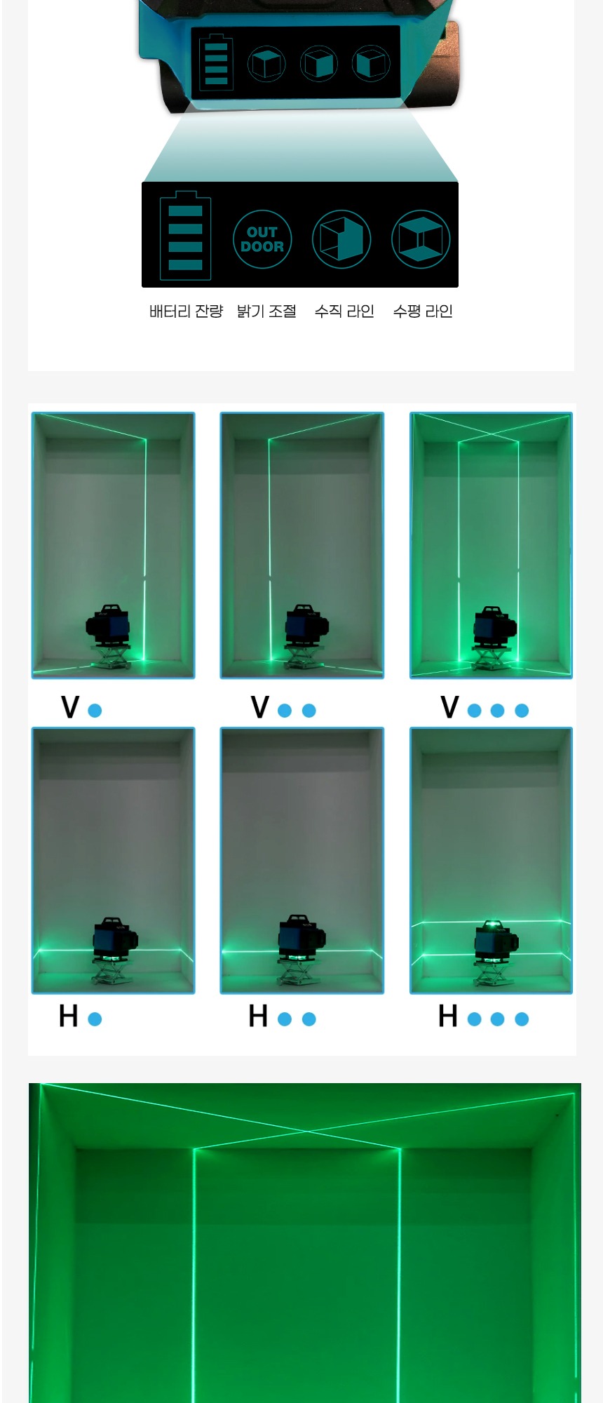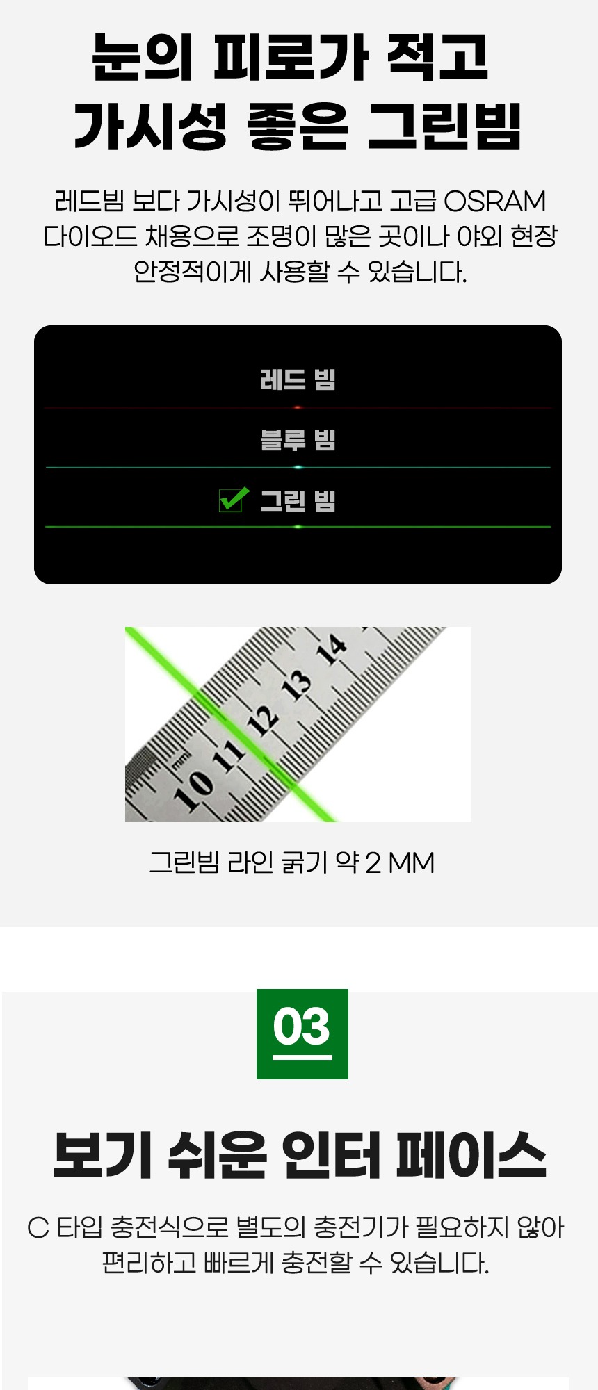 레이저 등급 : 2급 레이저 색상 : 그린 레이저 파장 : 532mm 정밀도 : ± 3mm / 10m 자동 조절 각도 : ± 4 ˚