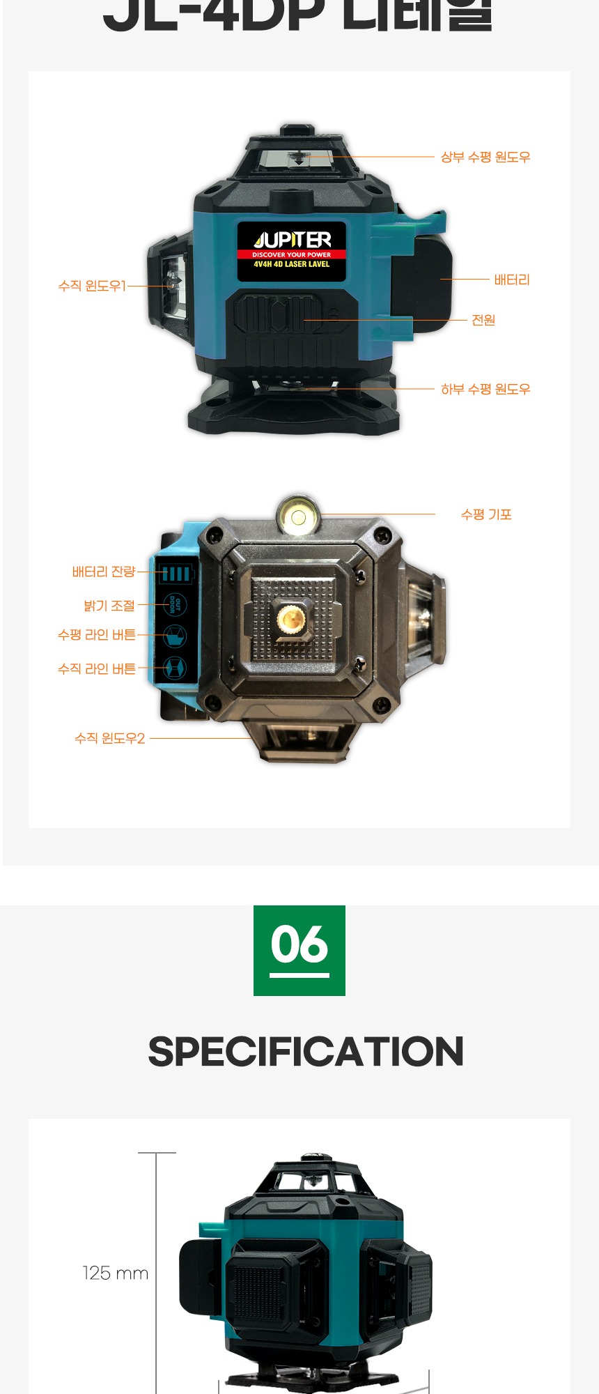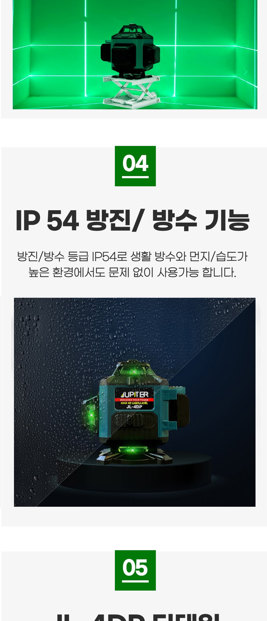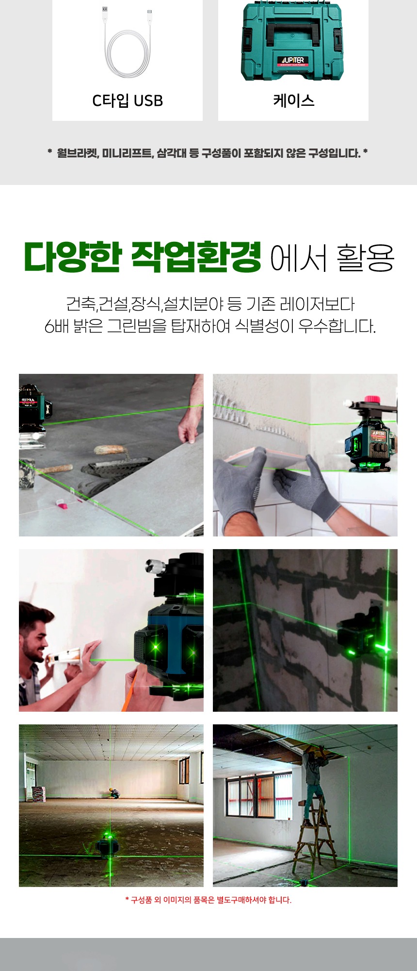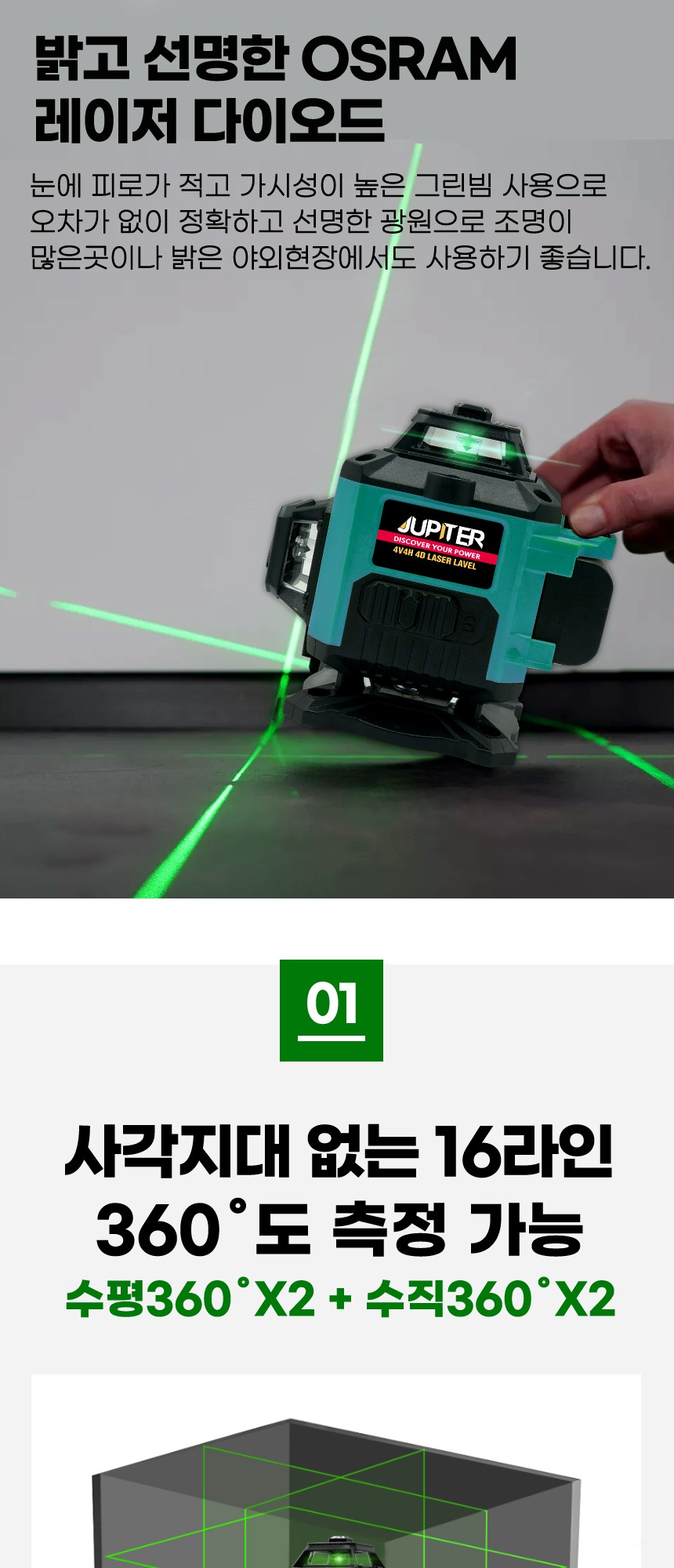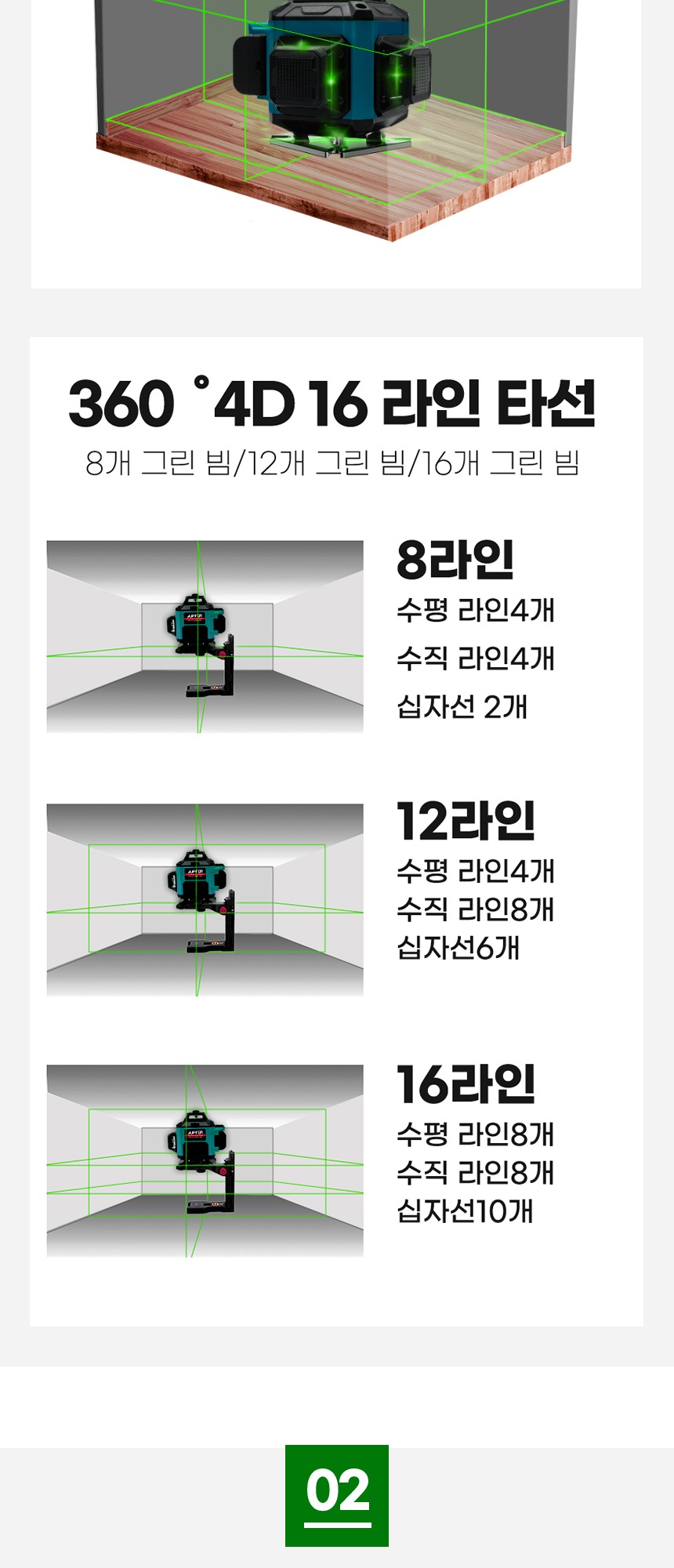 레이저 등급 : 2급 레이저 색상 : 그린 레이저 파장 : 532mm 정밀도 : ± 3mm / 10m 자동 조절 각도 : ± 4 ˚