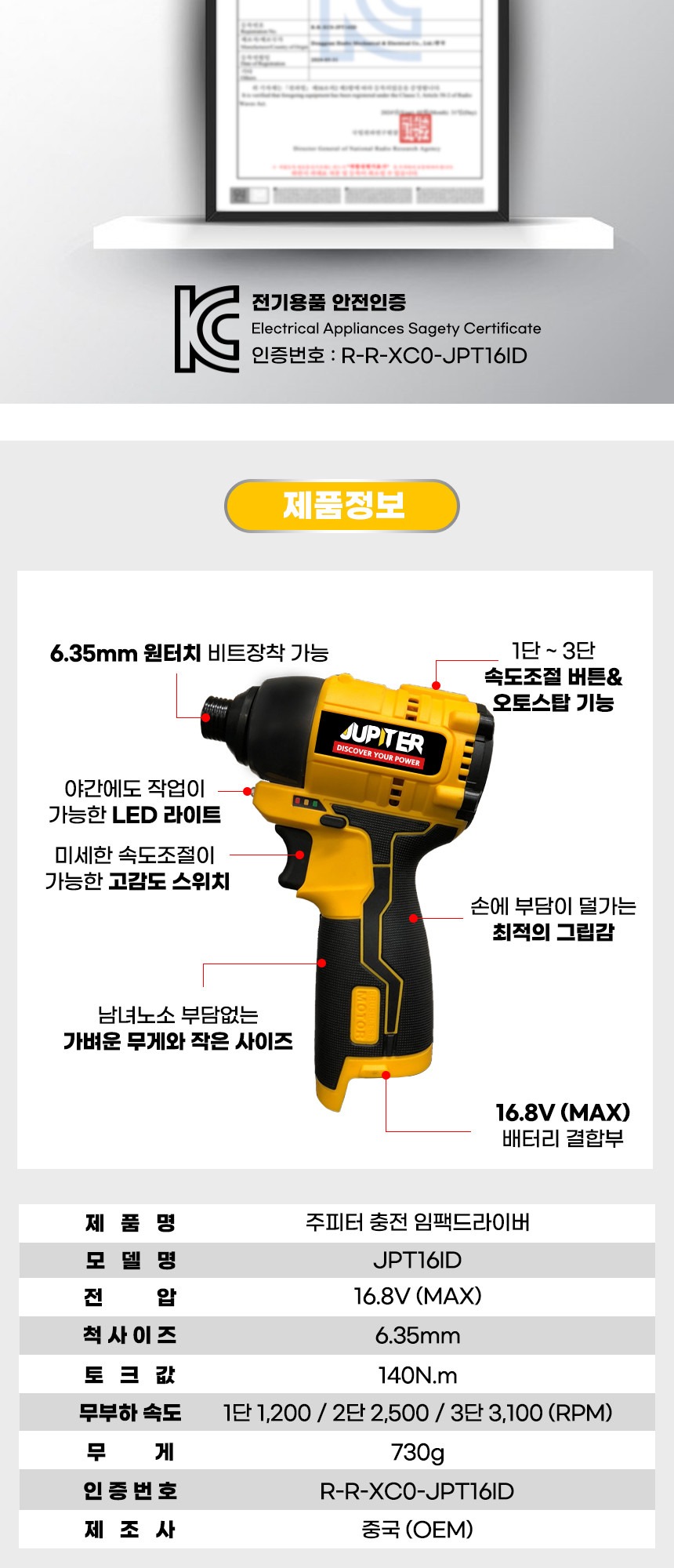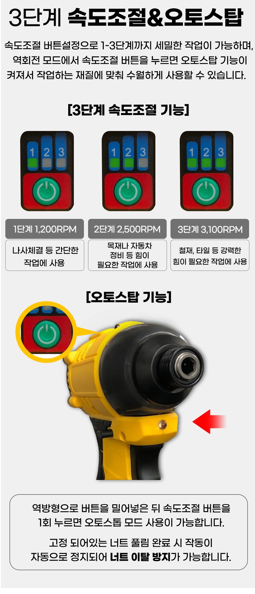 무부하 속도 : 1단 1,200 / 2단 2,500 / 3단 3,100 (RPM)