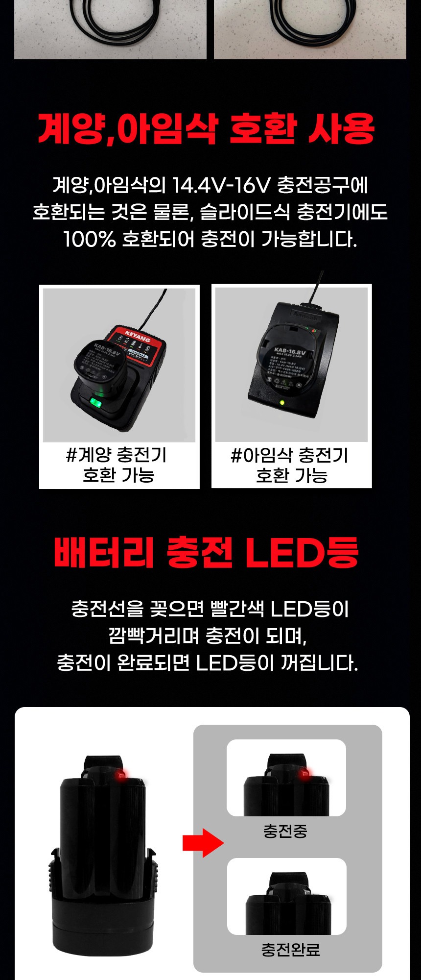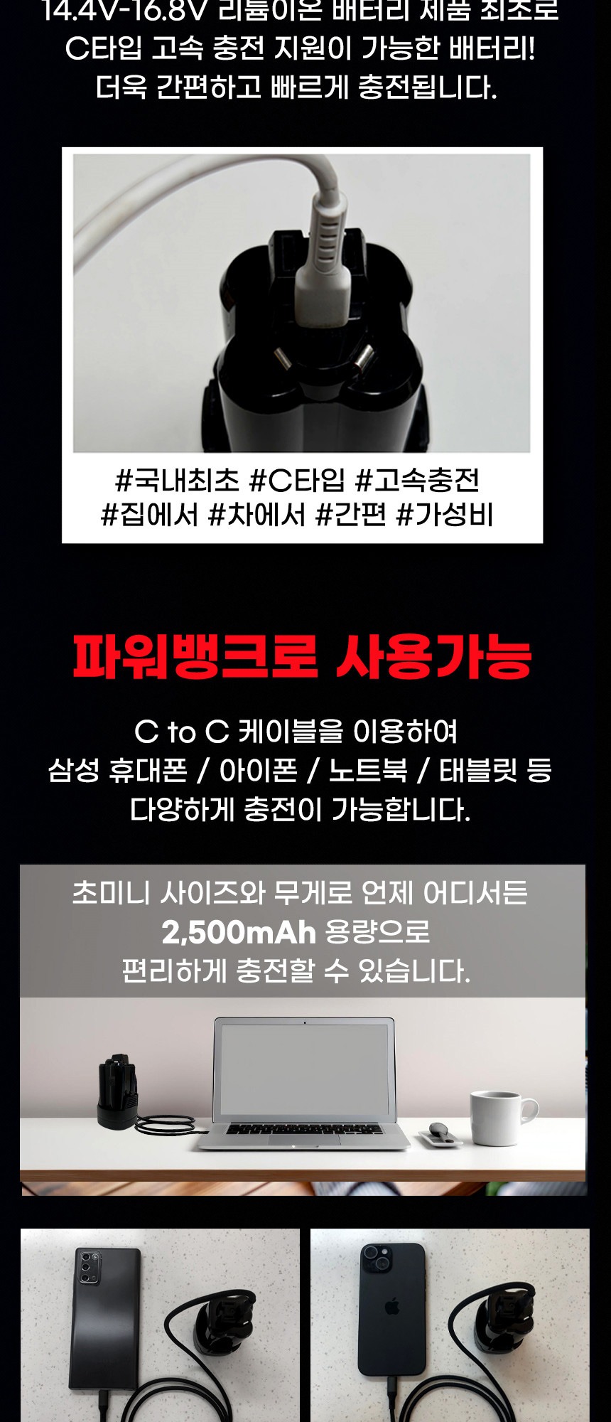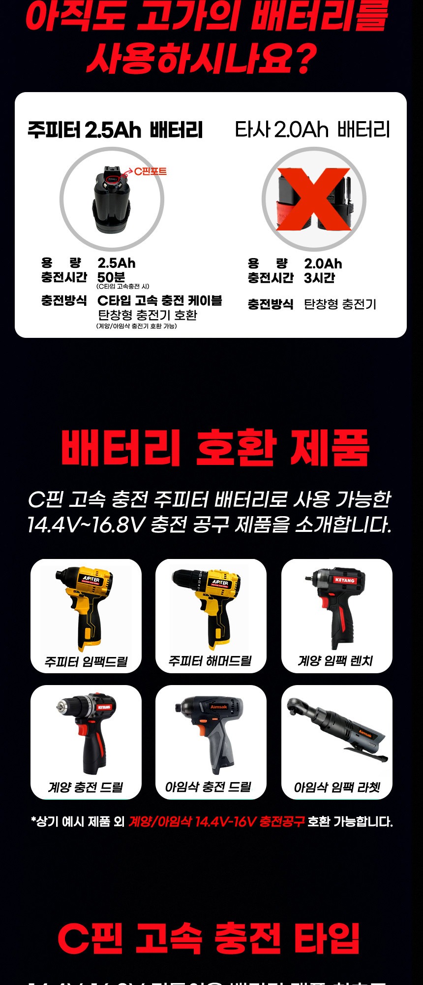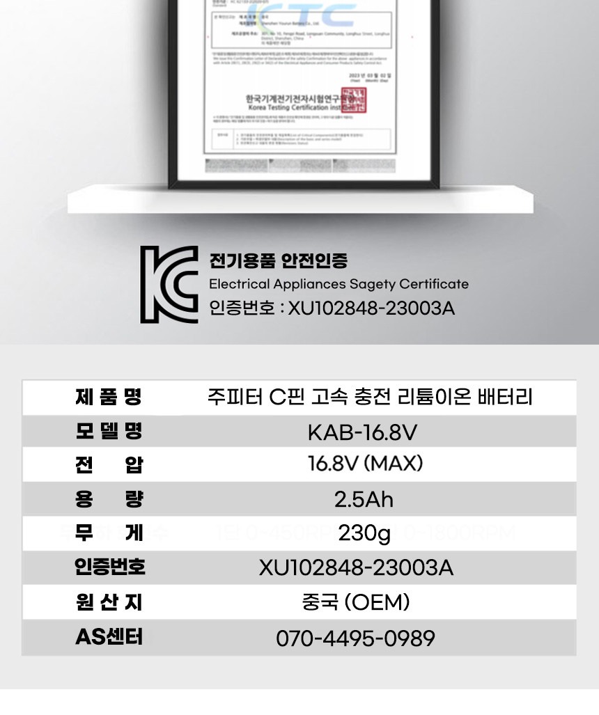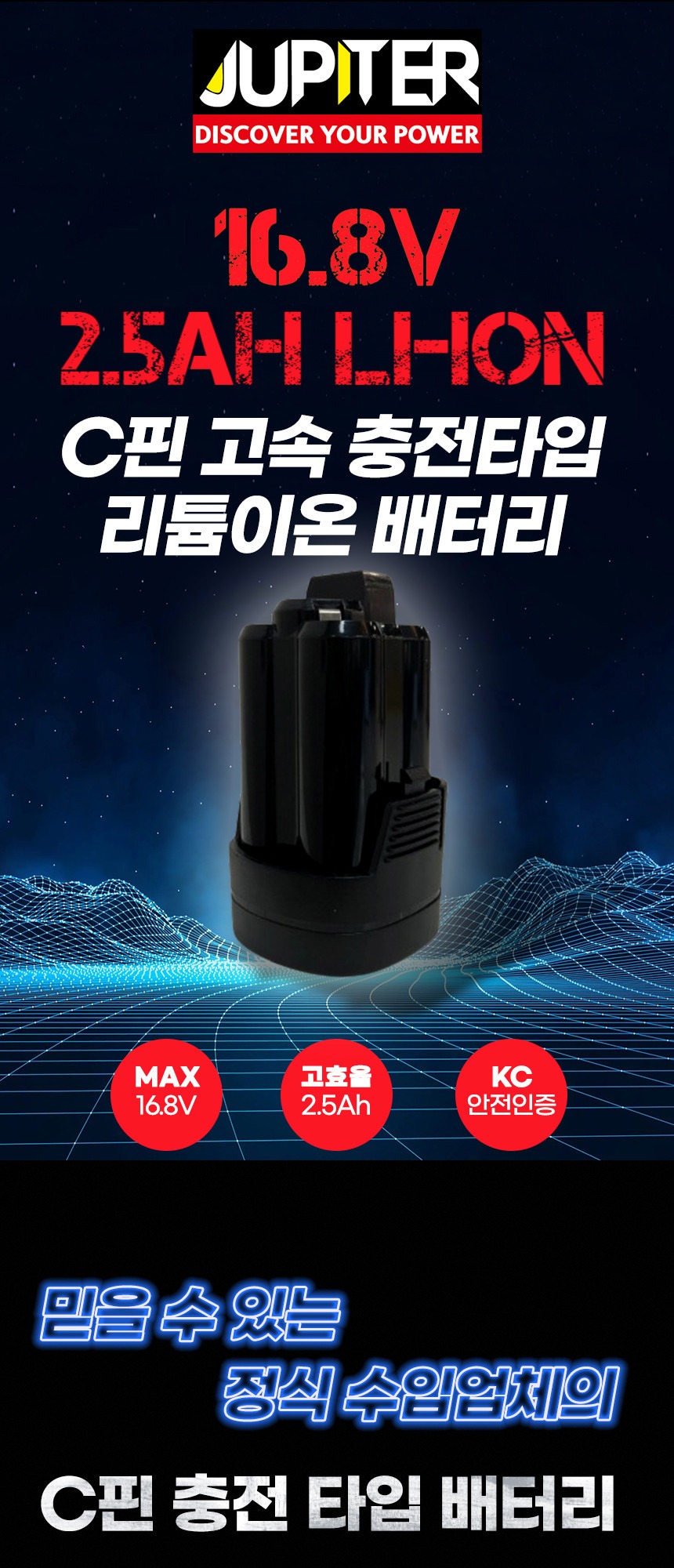 전압 : 16.8V(MAX) 용량 : 2.5Ah 호환 : 주피터, 계양, 아임삭 특징 : 고속충전, C타입 케이블 충전